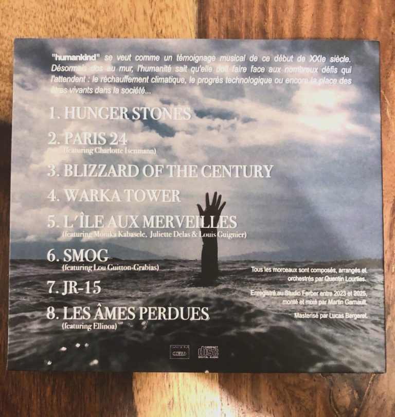 Quentin Lourties dirigent son big band d’une vingtaine de musiciens les plus reconnus de la scène française et nous offre son projet le plus abouti. On ne s’ennuie pas une seconde, constamment tenu en haleine par des pièces contrastées, vivantes, parfois brutales, parfois enfantines, qui deviennent des espaces de réflexion, d’émotion et de résilience. Les thèmes abordés allant du changement climatique dans tous ses extrêmes, la transformation de Paris pendant les JO, les bonnes inspirations de l’homme et ses pires absurdités, des odes au courage et à l’espoir. « Humankind » est essentiellement musical, à l’exception de deux magnifiques chansons « L’île Aux Merveilles » portée par les voix de Juliette Delas et Monika Kabasele et « Les Âmes Perdues » avec la voix d’Ellinoa de toute beauté et transcendante.